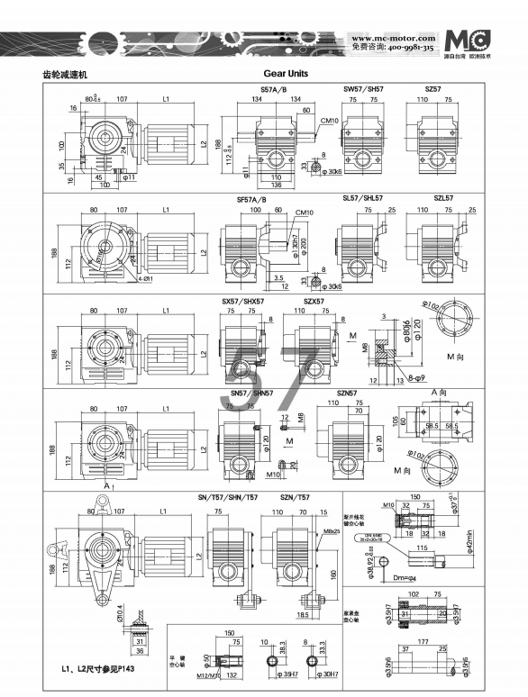 S57減速機又稱“同軸式齒輪減速機”,S57減速機為平行軸輸出,為斜齒輪硬齒面,耐沖擊力大。電機功率范圍為0.18KW~3KW,速比范圍為11.95~204,許用扭矩為300N.m,輸入方式可以配置直聯(lián)電機;可以配電機連接法蘭,用戶自配電機;可配軸輸入